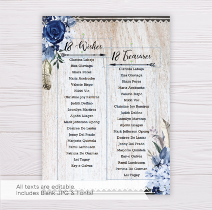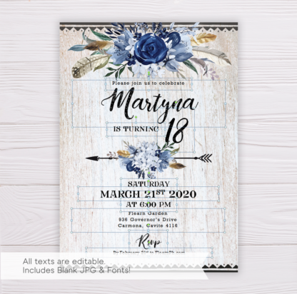Pretty Rustic Bohemian Debut Invitation Template with Wood Background & Watercolor Blue Flowers Design. Editable in Microsoft Word, this printable/ready to print template comes with blank image templates that you can use for other purposes!