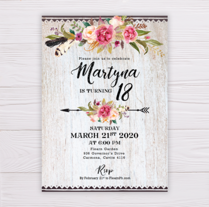 Pretty Rustic Bohemian Debut Invitation Template with Wood Background & Watercolor Pink Flowers Design. Editable in Microsoft Word, this printable/ready to print template comes with blank image templates that you can use for other purposes!