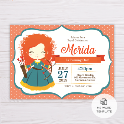 Cute/Adorable Disney Baby Princess Merida Birthday Invitation Template. Editable in Microsoft Word, this printable/ready to print template comes with blank image templates that you can use for other purposes!