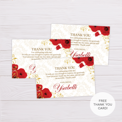 Beautiful & Elegant Royal Debut Invitation Template with Gold Ornaments & Red Flowers Design fit for a princess! Editable in Microsoft Word, this printable/ready to print template comes with blank image templates that you can use for other purposes!