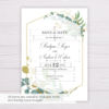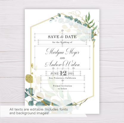 Beautiful & Elegant Save the Date Template with Gold & Green Watercolor Eucalyptus Leaves Design. Editable in Microsoft Word, this template comes with blank image template that you can use for other purposes!