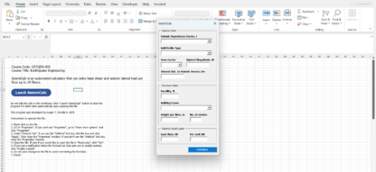 SeismiCalc is an automated calculator made using Microsoft Excel VBA and Userform that can solve base shear and seismic or earthquake lateral load per floor up to twenty (20) floors. Applicable for Microsoft Office 2021 and later versions. Only supports NSCP 2015.